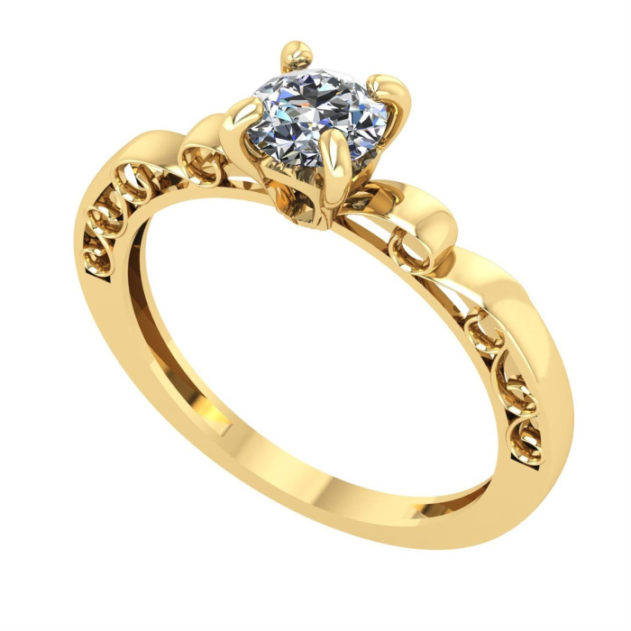 Anel de ouro amarelo solitário com detalhes no aro e pedra de zircônia