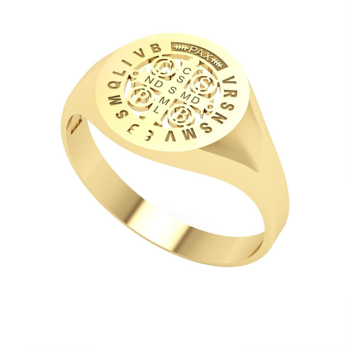 Anel de ouro amarelo com medalha de São Bento pequena