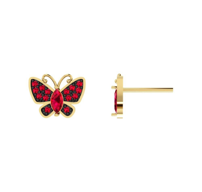 Brinco de borboleta cravejada com zircônias vermelhas em ouro amarelo.