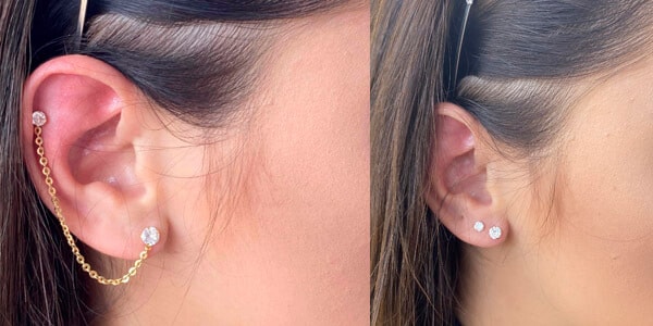 Essa ideia é super legal por compor 2 brincos sendo um para primeiro furo e ouro para o furo de cima da orelha, e a corrente ligando eles. Há possibilidade de tirar a correntinha e usar apenas os brincos. Super versátil. Acompanha o PAR
