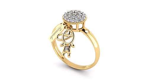 Um lindo anel em Ouro com pingente de menino, plaquinha e pedras de zircônia.