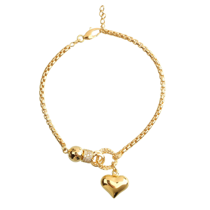 Pulseira em Ouro malha Milano com Mix de Pingentes: Coração Liso, Elos, Separador Cravejado e Bola Diamantada.