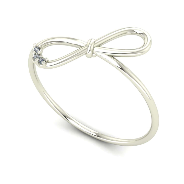Praticamente coringas em qualquer porta joia, anel de laço nunca vai sair de moda, com pedras três pedras de diamante e aro liso ele é muito delicado.