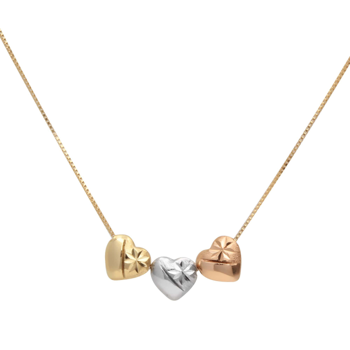 Linda gargantilha com três corações em três cores de ouro, o amarelo, branco e rose, para completar o charme ele tem um detalhe diamantado, e fosco, já com a correntinha veneziana para ficar mais lindo e completo, esta gargantilha é romântica e muito delicada, podendo usar em todas as ocasiões, com mais acessórios ou não, ela esbanja delicadeza e não pode faltar em seu porta joia.
